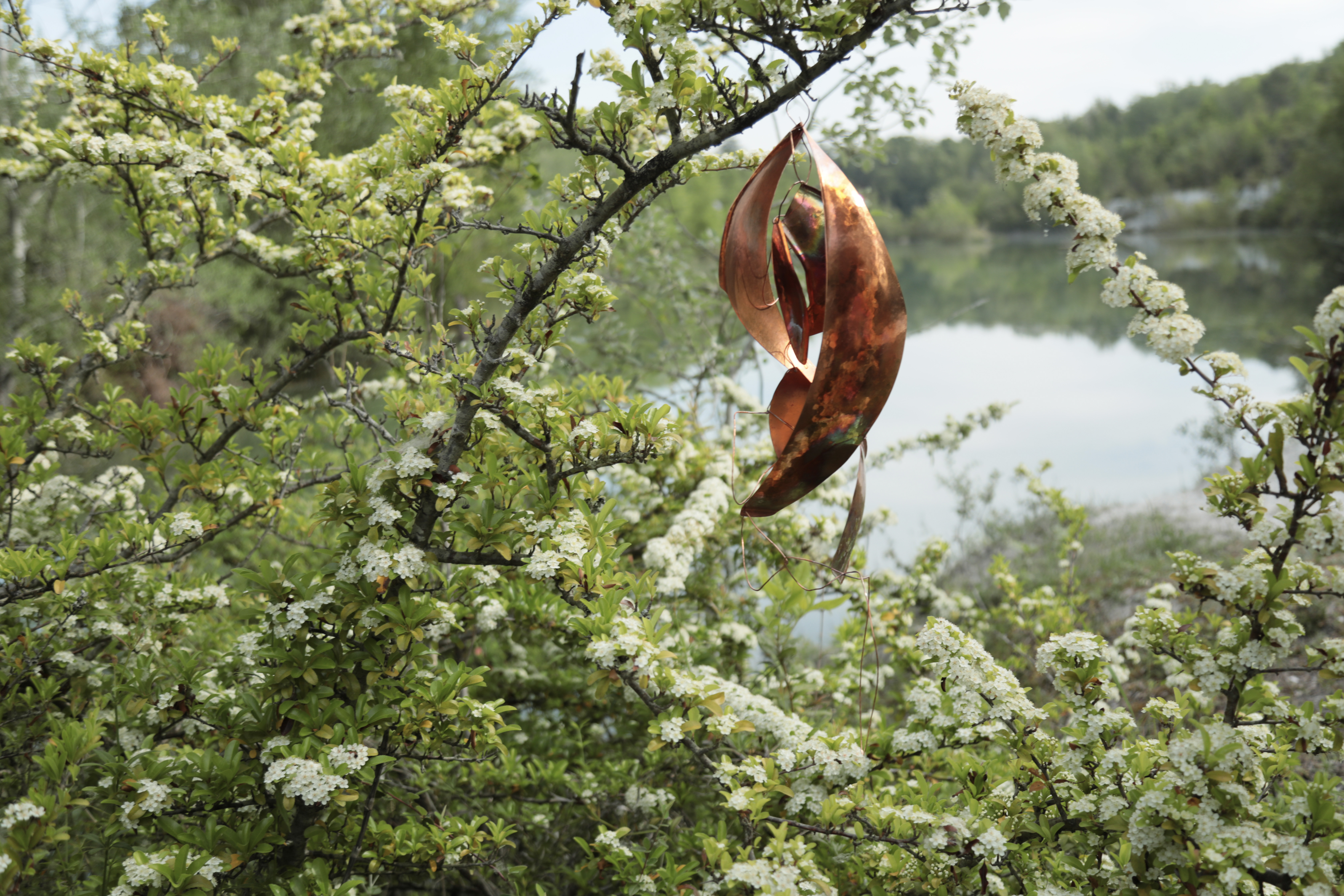 Recherchez ce moment suspendu à travers lequel plus rien n'existe que la lumière émise par notre étoile. À l'aube, en plein jour où au crépuscule. Le cuivre et ses couleurs de chauffe, flamboyantes, renvoient chacun de ses rayons. Il exerce sur moi une fascination proche de celle qu'ont les civilisations pour le soleil depuis la nuit des temps. Lorsque le brise s'en mêle, la suspension apparaît incandescente. Comme ce feu de bois autour duquel des générations se réunient. Elles le font encore. C'est un héritage, une méditation, un repos.